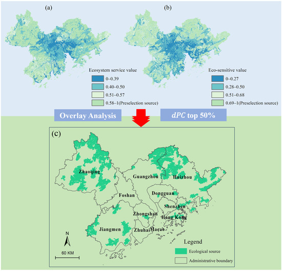 (a–c) Spatial distribution of ecological sources (Note: (a) Ecosystem services (b) Ecological sensitivity (c) Ecological sources).
