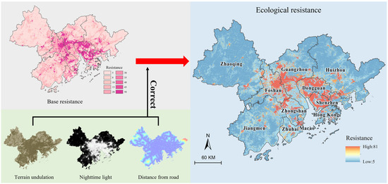 Ecological resistance refers to the intensity of obstruction when the ecological flow migrates between different landscape units, reflecting the interference of external conditions on ecological flow [4,61]. Based on the relevant research [5] and the regional characteristics, this paper first gives the initial resistance value on the foundation of the land use situation (Table 4), and then corrects it by Equation (10) with 3 factors of night light intensity, terrain undulation, and distance from the road to obtain the comprehensive resistance value of each unit, thus constructing the resistance surface.