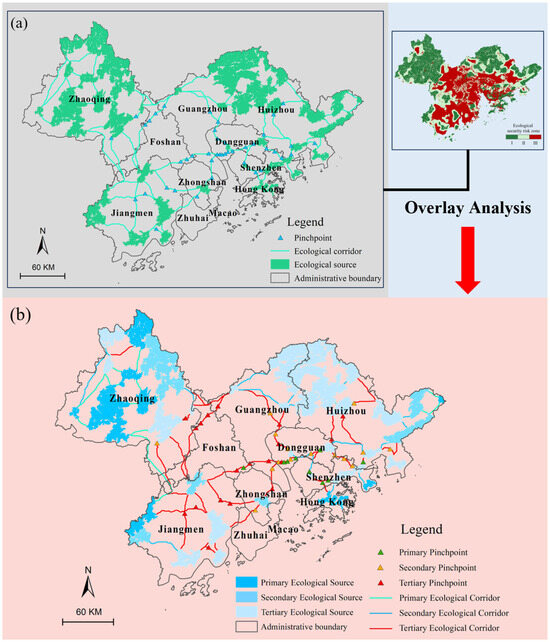 (a,b) Multi-level ecological security patterns in the study area in 2020 (Note: (a) Ecological security patterns (b) Multi-level ecological security patterns).