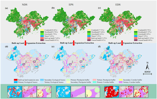 The 2035 land use pattern (Figure 6a–c) under the NDS, EPS, and EDS in the study area was simulated by the PLUS model. The expansion degree of built-up land in 2020–2035 is significantly different under different scenarios, and the built-up land area will increase by 15.91%, 0.79%, and 45.79% under the NDS, EPS, and EDS, respectively. Obviously, the built-up land under the EPS increases slightly and mainly expands around the existing built-up land, which can effectively control the scale and speed of construction occupation of arable land and ecological land.