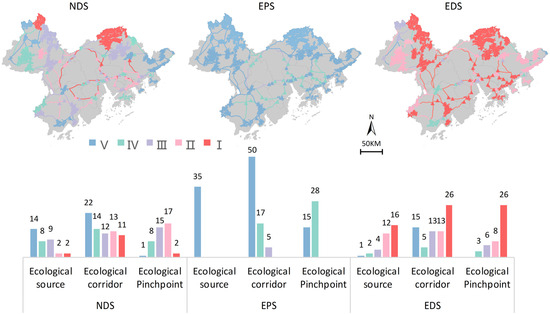 - Under the NDS, the warning level is between the EPS and EDS. The ecological source warning level is relatively good, and the number of severe and extreme warnings is at a low level. The number of severe and extreme warnings in ecological corridors is relatively large, mainly distributed in the center of the study area, connecting all parts of the area. The situation of ecological sources is slightly serious and needs to be addressed. In pinch points, there are many severe warnings, mainly in ecological corridors on both sides of the Pearl River Estuary.