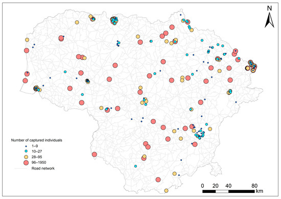 Small mammal trapping sites in Lithuania, 1980–2023. Dot size corresponds to the number of analyzed individuals. Redrawn from [47].