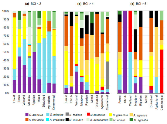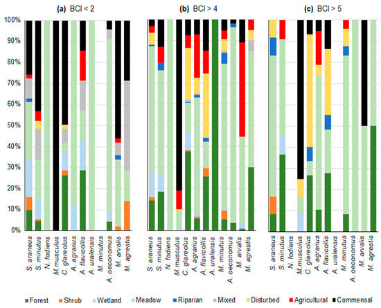 Among individuals of different species with BCI > 4, the majority of S. araneus, S. minutus, N. fodiens, A. agrarius, M. minutus, A. oeconomus, and M. agrestis were captured in meadows, while the majority of C. glareolus and A. flavicollis were caught in forests. M. musculus was found in commensal habitats, and the majority of M. arvalis were captured in agricultural settings (Figure 2b).
