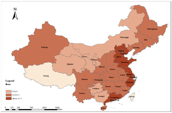 From the overall trend of the national LGUE over time, the average efficiency in the country increased from 0.470 in 2009 to 0.656 in 2022, indicating that the value is gradually increasing during the research period. From different large regions (eastern, central, and western), there are significant differences in LGUE between regions. The average value of the eastern region is 0.887, the central region is 0.635, and the western region is 0.447. Combined with the spatial distribution of efficiency values at the city, provincial, and municipal levels, the spatial differentiation characteristics of urban LGUE can be summarized as gradually decreasing from the eastern coast to the northwest inland area (Figure 1). The main reason is that the eastern is economically developed, and cities have an absolute advantage in “hardware” construction and “software” construction [36,37], which can attract more investment and further promote faster urban development; the city’s industrial structure and layout are more rational, and the agglomeration effect is more obvious, which can greatly reduce costs and save space; meanwhile, the “pollution reduction effect” of industrial structure optimization and technological progress begins to emerge [38,39]. All of these aspects are conducive to improving LGUE. In contrast, the economic development in the central and western regions is relatively slow, the regional environment and investment environment are obviously not as advantageous as in the eastern region, urban infrastructure is insufficient, technological progress levels are relatively low, and the industrial structure is not rational, which is insufficient to generate agglomeration effects to reduce costs. This is also not conducive to reducing pollution emissions per unit of output, ultimately leading to low urban LGUE.