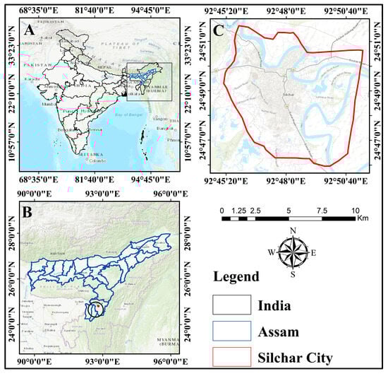 Figure 1. Location map of the study area (A) India and Assam, (B) Assam and Silchar, and (C) Silchar City.