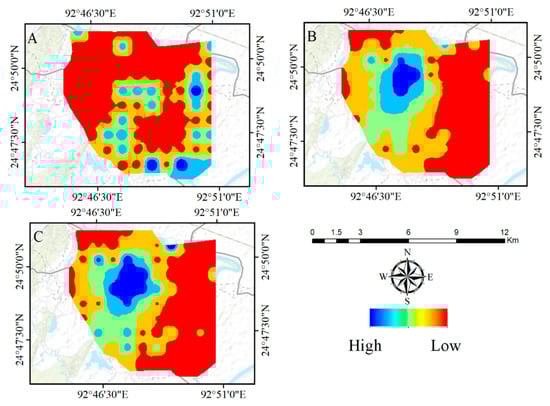 Silchar serves as the administrative hub for the Cachar district in Assam, situated in the northeastern region of India. The city’s geographical coordinates extend from 24°47′ N to 24°82′ N in latitude and 92°45′ E to 92°52′ E in longitude. This region has a subtropical climate that is warm and humid. It receives 2500–4000 mm of annual rainfall, with more than 80% of that falling between April and October, and the mean annual T m a x and T m i n temperatures range between 17.74 °C and 19.67 °C and 25.47 °C and 29.25 °C, respectively. The vegetation at the river’s edges is sparse. Bamboo brakes (Banbusoidae), wet and dry grassland (Phragmmitiskaraka), and scrublands are the most popular plant habitats [51]. Prolific tea farms line the region’s borders. The city has a total of 228,985 people [52,53]. From 2000 to 2020, the annual population increase was reported to be 29.24% (Figure 2). The progression from Figure 2 panels A to C clearly illustrates an increase in population density, especially in the city center, quantifying and spatially representing the rapid urbanization process in Silchar over the study period. Silchar’s limited economic growth has been attributed to its geographical isolation and insufficient infrastructure and communication networks. However, in recent years, the town has seen a surge in business activity and has been steadily growing [53]. The town generates approximately 100 tons of municipal garbage daily, which is also responsible for the increase in cancer patients [53,54]. The former prime minister of India, Smt. Indira Gandhi named this place an “Island of Peace”. Silchar serves as a gateway to the neighboring states of Manipur and Mizoram.