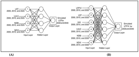Figure 4. ANN model architecture for predicting (A) LST and (B) UTFVI.