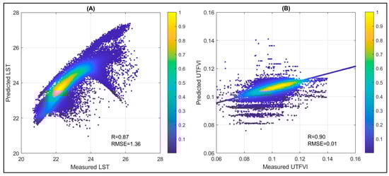 Figure 5. Predicted and measured (A) LST and (B) UTFVI for 2020.