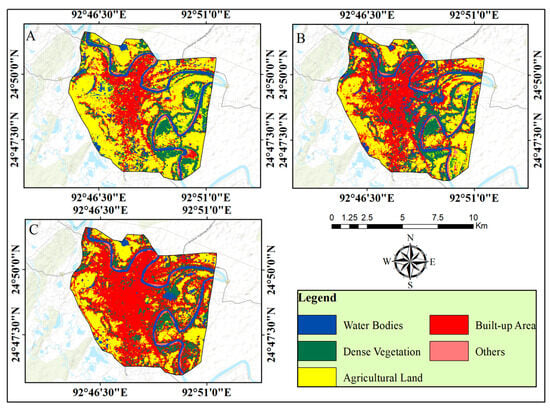 Figure 6. LULC for the years (A) 2000, (B) 2010, and (C) 2020.