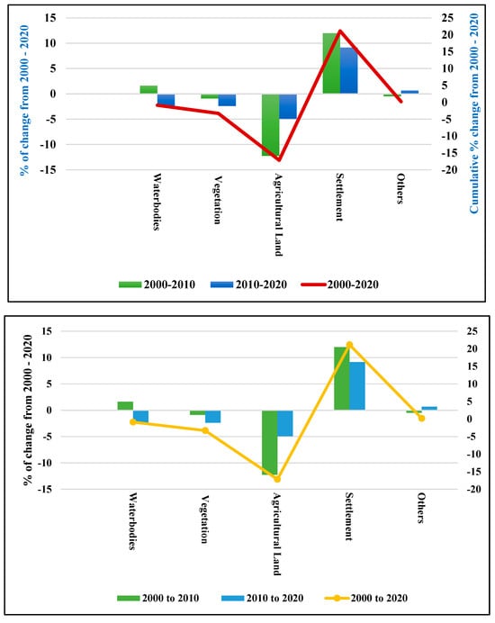 With the help of the MLSC method, we classified the Landsat image (TM/OLI) into five classes and calculated the area change in LULC from 2000 to 2020 (Figure 6). The color-coded maps clearly show the spatial distribution of different land use categories and how they changed over time. It can be observed that the trend changed for various classes, like a gradual increase in water bodies and the built-up area with a decrease in agricultural land and vegetation areas during the study period. Figure 7 quantifies the decadal percentage change in area for each LULC category from 2000 to 2020. The bar graph clearly shows a significant increase in settlement areas and a corresponding decrease in agricultural land and vegetation. This visualization helps quantify the urbanization trends observed in the LULC maps.