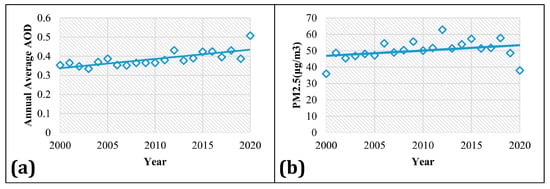 Figure 8. Annual average trend in (a) MODIS AOD and (b) PM2.5 for the last two decades in the study area.