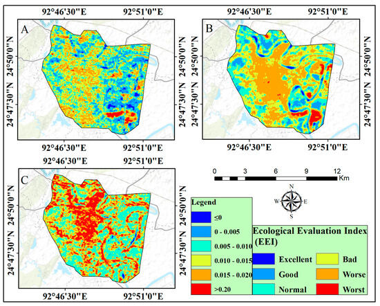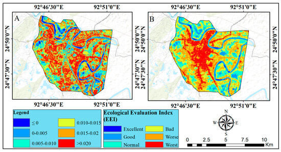 where Tm T m is the mean LST and Ts is the LST in degree Celsius (°C). Subsequently, the value of the UTFVI was bifurcated into six ecological evaluation indices [65], which were used to evaluate the city’s thermal comfort. The thermal variability index (UTFVI) of Silchar City was divided into six categories as follows: excellent, good, normal, bad, worse, and worst [37,66].