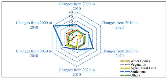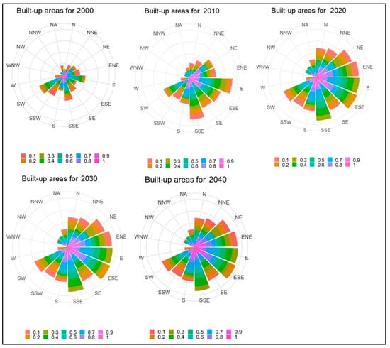 The preceding LULC maps for the years 2000, 2010, and 2020 were utilized to predict the LULC scenario for the years 2030 and 2040 (Figure 9). The predicted results show that the urban area will be 47.63% of the total area in 2030 and will increase by another 2.69%, covering 50.32% of the total area in 2040. It is evident from the figure that the built-up areas in 2040 increased significantly in every direction as compared with the year 2000. The east, east–south–east, and south–south–east directions will see the most noticeable increase in the urban area, while the west and north–west directions will see the least. This is because the terrain in the west and north–west is highly undulated and suitable for tea farming, whereas the terrain in the east and northeast is flat and suitable for settlement (Table 6).