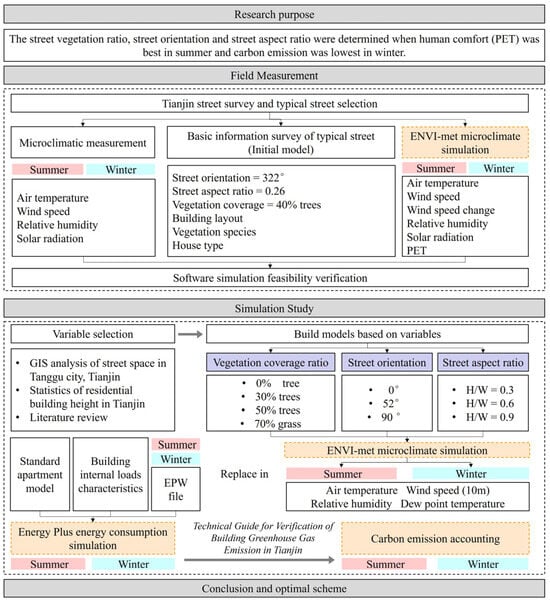In summary, the current research on UHIs’ effect on building energy consumption and carbon emissions predominantly addresses zones with hot summers and cold winters or hot summers and warm winters. Cold zones have been considerably less studied. Given the diverse energy usage patterns and urban forms across different climate zones, which impact the microclimate and, consequently, energy consumption and carbon emissions, findings from warmer zones are not necessarily applicable to colder ones. Most studies on the relationship between urban forms and carbon emissions have focused on provincial levels or large urban agglomerations, with limited street-level exploration []. Although recent research on zero-carbon community construction has emerged, the mechanisms connecting urban forms and carbon emissions at this scale remain underexplored. Additionally, the existing studies have primarily addressed thermal environments and energy consumption, often overlooking carbon emissions [,,]. Furthermore, findings from macro-scale research do not provide actionable insights for block-scale planning, underscoring the need for targeted studies on block-scale carbon emissions in cold climates. This study aimed to optimize street layouts, including vegetation ratios, street orientations, and street aspect ratios, in cold zones, ensuring thermal comfort and low carbon emissions in building energy consumption. Ultimately, this study sought to mitigate the UHI effect and determine the most effective street space design for these regions. The flow chart of this research is depicted in Figure 1.