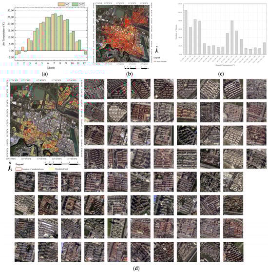 The basic situation of the study area: (a) monthly temperatures in Tianjin in 2021 and 2022; (b) ArcGIS 10.5 analysis of street orientation in Tianjin; (c) Tianjin street orientation statistics; (d) satellite imagery slices of the block forms of residential areas; (e) street location; and (f) street sections.