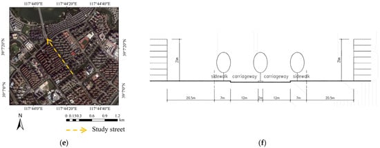 Therefore, considering the most common and representative residential spaces in the study area, a specific street facing northwest–southeast (322°) with H/W = 0.26 and 40% trees was selected for a detailed analysis to optimize the area’s thermal environment, energy consumption, and carbon emissions (Figure 2e,f). The research model can encompass some common residential layout patterns found in Tianjin by adjusting the three variables: the vegetation ratio, street orientation, and aspect ratio.