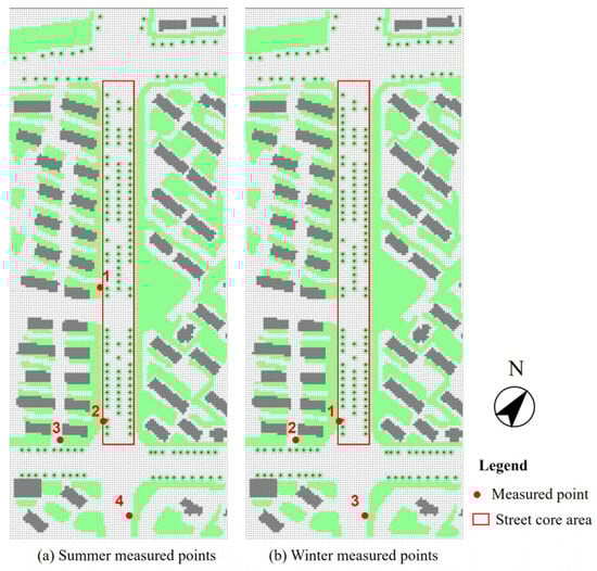 We conducted field measurements at 4 points during summer and 3 during winter within the study area to support the ENVI-met 5.6.1 simulation with model and meteorological data and verify its applicability and authenticity in this region (Figure 3). The measurements ran from 8:00 to 20:00, with data collected every 10 min, totaling 12 h of recorded data. The meteorological data were obtained from the NOAA and NCEI (site no. 54527099999, TIANJIN, CH; site no. 54527399999, BINHAI, CH).