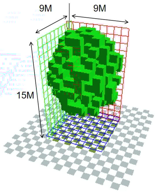 ENVI-met 5.6.1 is applicable to varied urban forms and green features []. Rich vegetation databases [] have significantly enriched microclimatic studies on streets and buildings [,]. The simulation settings are detailed in Table 1. We concentrated on the core street area, analyzing the air temperature, wind speed, and PET at a 1.5 m height (Figure 3). Average values from various field measurement data points, combined with the Meteorological Bureau data, optimized the model’s hourly temperature and humidity [], ensuring simulation accuracy. We utilized leaf area density (LAD) data for the same tree species in similar climates [,], establishing a tree model in Albero (Figure 4) with a LAD of 1.0 and a December seasonal leaf factor of 0.3.