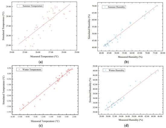 Consistency verification of measured and simulated temperature and relative humidity. (a) Consistency verification of measured and simulated temperature in summer; (b) consistency verification of measured and simulated humidity in summer; (c) consistency verification of measured and simulated temperature in winter; and (d) consistency verification of measured and simulated humidity in winter.