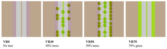 - The univariate experiment on the vegetation ratio: The street area, comprising traffic lanes, sidewalks, and green belts, was modeled with different vegetation quantities, types, and layouts, resulting in scenarios with 0% (VR0), 30% (VR30), 50% (VR50) trees, and 70% grass (VR70) (Figure 6).