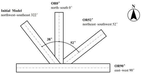 - The univariate experiment on the street orientation: The street orientation directly influences the street’s angle relative to monsoon winds and solar radiation. New models were constructed by altering the model’s direction. These models were configured with different orientations: north–south (N–S) at 0° (OR0°), northeast–southwest (NE–SW) at 52° (OR52°), and east–west (E–W) at 90° (OR90°) (Figure 7). The angle between the street and the monsoon is shown in Table 2.