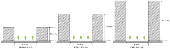 - The univariate experiment on the street aspect ratio: New models were created by altering the building heights on either side of the street, thus adjusting the ratio of building height to the street width. The models were set with varying aspect ratios: H/W = 0.3 (HW0.3), H/W = 0.6 (HW0.6), and H/W = 0.9 (HW0.9) (Figure 8).