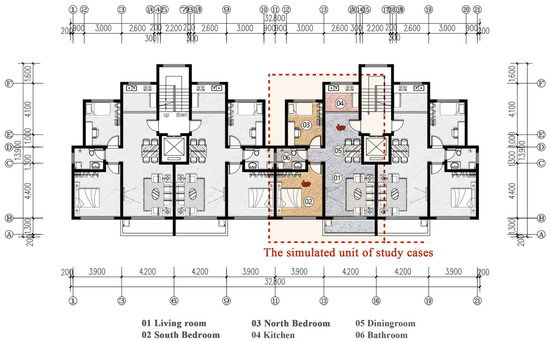 We utilized Energy Plus to analyze the standard units (Figure 9) on the first, third, and fifth floors of the apartments in the study area, assessing their energy consumption across various conditions. These floors represented different outdoor microclimates. We could draw more accurate conclusions by calculating the energy use and carbon emissions specific to each apartment type. We compared the energy consumption during a typical summer day to winter conditions across ten scenarios to identify the most energy-efficient street space characteristics. The detailed design specifications for the apartments are provided in Table 3. The internal load characteristics are outlined in Table 4, based on the Chinese standard GB 55015 [] and household survey data. Air conditioning was activated when indoor temperatures exceeded 26 °C in summer, and boiler heating was triggered below 18 °C in winter, with other building features set to default values in Energy Plus.