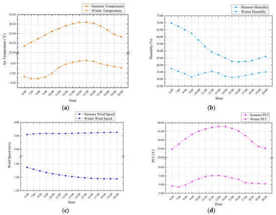 Figure 10 illustrates the solar radiation pattern simulated with ENVI-met 5.6.1. The shadow cast by buildings was minimal in summer (Figure 10a) and more pronounced in winter (Figure 10b), with the narrowest shadow occurring from 10:00 to 12:00. Street temperatures rose throughout the morning, reaching a high of 28.39 °C in summer and a modest 0.61 °C in winter at 15:00 (Figure 11a). Summer humidity plummeted to 42.29% by 16:00 before increasing as solar radiation diminished. Winter humidity remained stable (Figure 11b). The wind speed was 1.38–1.55 m/s in summer and 3.82–3.85 m/s in winter, which was significantly higher (Figure 11c). The PET escalated to its peak at 13:00, registering at 37.86 °C in summer and 5.20 °C in winter, which was more gradual (Figure 11d).