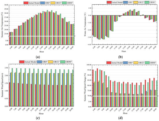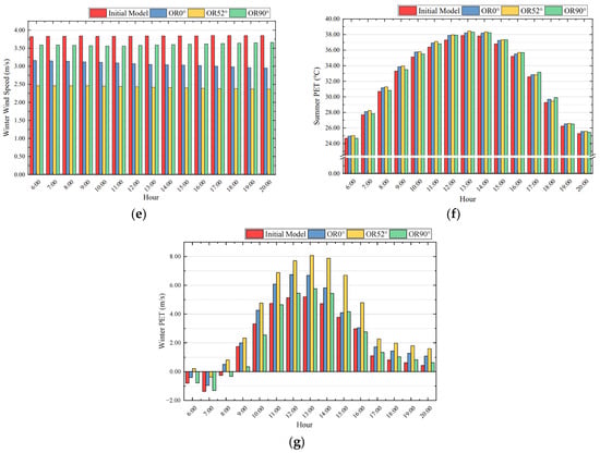 Microclimate at different street orientations: (a) summer air temperature of different street orientations; (b) winter air temperature of different street orientations; (c) summer wind speed of different street orientations; (d) summer wind speed change of different street orientations; (e) winter wind speed of different street orientations; (f) summer PET of different street orientations; and (g) winter PET of different street orientations.