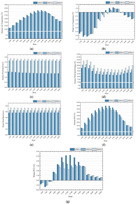 Microclimate at different street aspect ratios: (a) summer air temperature of different street aspect ratios; (b) winter air temperature of different street aspect ratios; (c) summer wind speed of different street aspect ratios; (d) summer wind speed change of different street aspect ratios; (e) winter wind speed of different street aspect ratios; (f) summer PET of different street aspect ratios; and (g) winter PET of different street aspect ratios.