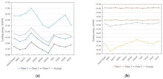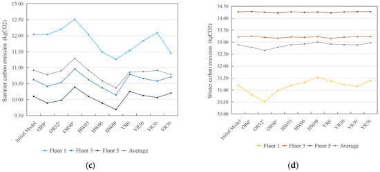 The energy consumption of the first, third, and fifth floors during summer and winter was calculated and compared with the initial model (Figure 15). The first-floor units exhibit higher carbon emissions in summer and lower emissions in winter than the other floors. Summer emissions decreased as the floor level increased, while the winter energy demand significantly rose. The average winter energy consumption was approximately 6.0–6.6 times that of summer (Table 5). The carbon emissions were approximately 2.9–3.2 times higher, underscoring the need for winter carbon reduction.