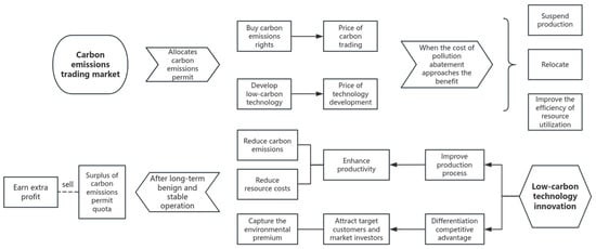 After greenhouse gas rights are confirmed, its market characteristics such as scarcity, commodity and trading become obvious; the carbon emissions trading market emerges soon after. In this market mechanism, the upper amount limit that enterprises are willing to pay for the purchase of carbon emissions rights is called the “green premium”, but when the purchase price exceeds the cost of low-carbon technology innovation, which means the “green premium” exceeds the threshold, enterprises will be more inclined to their own green transformation and technological upgrading rather than buying emissions rights [15]. Because when the cost of pollution reduction approaches its benefit, the enterprises are faced with three choices: suspending production, relocating or improving resource utilization efficiency through innovation [28]. If the first two methods are chosen, a large number of productive investments will become sunk costs, so rational enterprises will choose the third method. Furthermore, green technology innovation can not only reduce total carbon emissions and resource costs, but also make enterprises earn extra profit by selling its surplus quota in the long run [3], as shown in Figure 1.