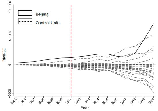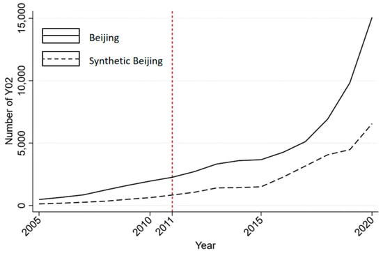 Figure 2 shows the number of low-carbon patents in Beijing and the corresponding synthetic units from 2005 to 2020. The two curves before the implementation of the pilot policy in 2011 are extremely close to each other, and the specific data are shown in Table 2. The difference value of the real Beijing and the synthetic Beijing are both small, with the largest being only 2.394%; this error is within scientific range compared with other existing studies. The control group can better simulate the innovation environment and the evolution path of low-carbon technology before and after the influence of the pilot policy.