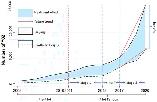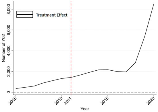 In order to confirm whether the method of division in the three stages above is scientific, this study continues to supplement the trend chart of the patent number difference between the real and synthetic Beijing from 2005 to 2020, that is, the “treatment effect” of the Synthetic Control Method. As shown in Figure 3, the results presented are consistent with the three-stage description, proving the rationality of the three stages of segmentation and the relevance of the policy effect to the length of implementation.