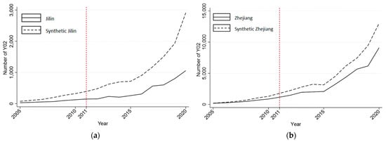 The most appropriate object for the Placebo Test is the city with the largest weight in Beijing; the greater the weight is, the closer the city is to Beijing. According to the results of the Synthetic Control Method above, Jilin and Zhejiang Provinces have the largest weight in the control group; thus, these two provinces were taken as placebo areas for the Placebo Test. Figure 4a,b show the results of the Placebo Test for Jilin and Zhejiang Provinces, respectively. The number of low-carbon patents in the synthetic provinces is significantly larger than that in the real provinces, and the difference in the numbers is not large, which proves the robustness of the conclusions of the Synthetic Control Method.