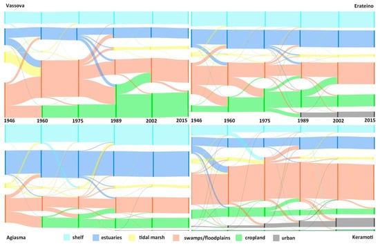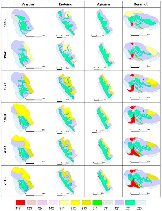 - Mallinis, G.; Emmanoloudis, D.; Giannakopoulos, V.; Maris, F.; Koutsias, N. Mapping and Interpreting Historical Land Cov-er/Land Use Changes in a Natura 2000 Site Using Earth Observational Data: The Case of Nestos Delta, Greece. Appl. Geogr. 2011, 31, 312–320. [Google Scholar] [CrossRef]