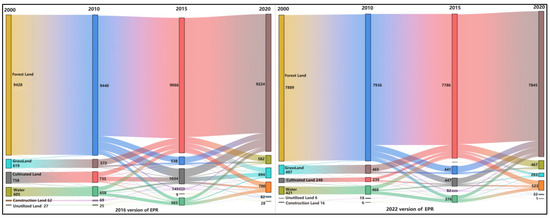 - The 2022 EPR facilitated more accurate ecological protection and better performance in managing the relationships between ecological protection zones, permanent basic farmland, and urban development boundaries. In geographical terms, the 2016 EPR’s cultivated land was predominantly located in the eastern and central regions. The 2022 version showed a substantial reduction in cultivated land especially in the central areas, though it maintained overall stability from 2000 to 2020. Both versions exhibited similar trends in forest land changes, with the 2022 EPR enhancing forest conservation efforts, particularly in the central and northern peripheral zones. While the 2016 EPR focused on conserving cultivated land and grasslands, the 2022 EPR excelled in construction land control and water resource management, indicating a strategic shift towards integrated ecological and resource protection.