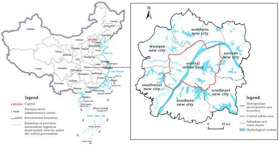 Wuhan, a provincial capital city located in central China, is currently undergoing rapid metropolitanization (Figure 1). With the growth of the population, its urban space has been continuously expanding outward, resulting in an evident trend of population suburbanization migration. According to Master Planning of Wuhan, its future development will focus on constructing a metropolitan development area, comprising 1 central urban area and 6 suburban new cities, serving as the primary areas for agglomeration and expansion in the future, with a total area of 3261 square kilometers [32,33]. Based on that, the current study has determined the regional boundaries of the central urban area and suburban new cities.