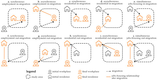 Based on this definition, this study uses whether the pre-migration and post-migration workplace and residence are in the same region as the standard, and primarily investigates the 10 types of individual migrations represented in Figure 2. Among these 10 types of migrations, the following five can promote regional jobs–housing balance: synchronous employment in-migration, synchronous residential in-migration, simultaneous jobs–housing in-migration, synchronous employment out-migration, and synchronous residential out-migration. The remaining five types, however, would lead to jobs–housing imbalance.