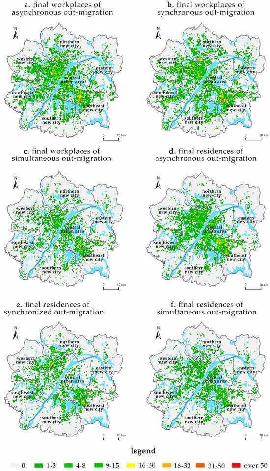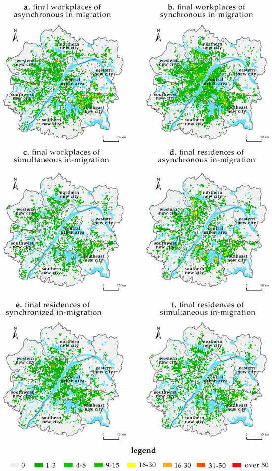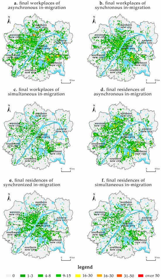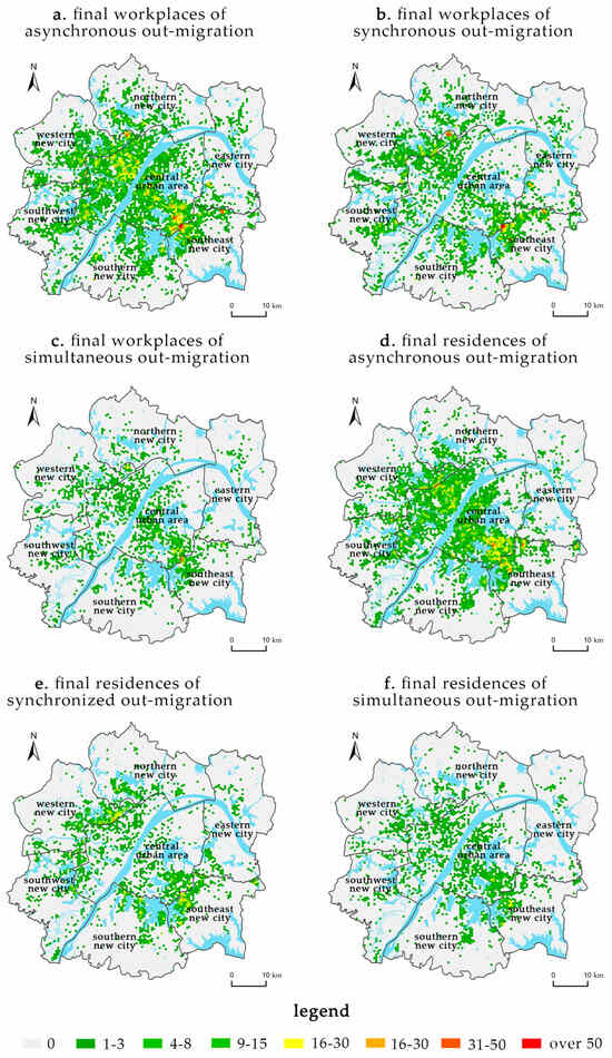 Targeting the “1 + 6” regions within the Wuhan metropolitan development area, this study established a square hexagonal grid with a side length of 330 m. Extracting totals by unit protects the privacy of individuals and is a common practice in cell phone data research [32]. First, it identified the employed population that experienced in-migration or out-migration between different regions during the periods of 2019–2021 and 2021–2023. Figure 3, Figure 4, Figure 5 and Figure 6 depict the spatial distribution of the migration origins and destinations of this population. Subsequently, based on Formulas (5)–(15), the study calculated the synchronous and asynchronous indices of employment and residential in-migration and out-migration for the seven regions within the Wuhan metropolitan development zone, with the results presented in Table 4 and Table 5.