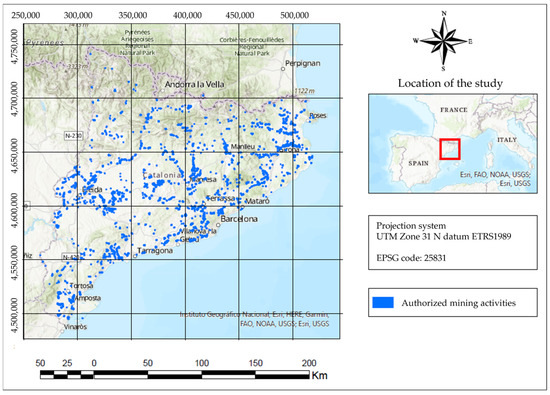 The area of interest (AOI) corresponds to the Catalonia region (NE Iberian Peninsula). The study is focused on the active mining activities found in the EXTCATA cartographic base [28]. This geodatabase is a vectorial file containing 2196 polygons that represent the mining activities’ public concessions. The attributes of the database are as follows: the exploitation code, the concessionary company, the mine name, the main extraction material, the state of restoration, the authorization typology, and the municipality. The vectorial layer is georeferenced in the UTM reference system zone 31N Datum ETRS89 (EPSG:25831) and is constituted by attributes that allow the identification of the materials extracted in each mining activity (Figure 1). The aggregated area corresponding to all the mining activities’ concessions reach a total of 16,952 ha (0.5% of the Catalonia region).
