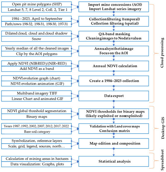 The workflow was addressed combining a cloud computing platform (GEE), a desktop GIS (QGIS), and a spreadsheet (Microsoft Excel), although most of the work is developed in the GEE environment (Figure 2).