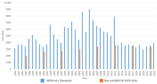 The results of the calculation of the denuded area corresponding to the exploited areas show a maximum area affected by the extraction of material/rock around 2005. Subsequently, a downward trend is observed, with small fluctuations in the area mined over the last 18 years (Figure 3). On the other hand, the orange color, in Figure 3, shows the bare soil surface extracted from the MUCSC series [32] within the EXTCATA cartographic base [28] polygons.
