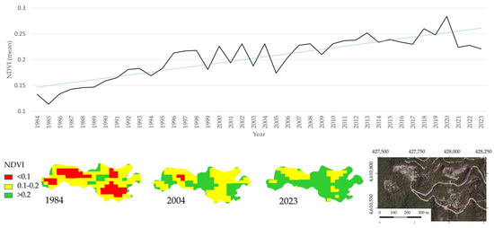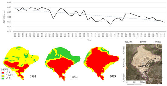 Example of the evolution of an extractive activity in exploitation according to the mean NDVI. Blue dotted line indicates linear trend. Classification according to NDVI thresholds: <0.1 exploited area, 0.1–0.2 sparsely vegetated area, >0.2 vigorously vegetated area. Orthophotography of year 2023 [33].