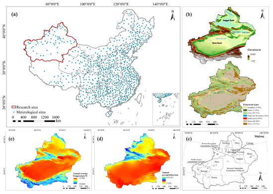 Overview of the research area. (a) Location and distribution of meteorological sites in Xinjiang. (b) Elevation and ecosystem types in Xinjiang. (c) Administrative divisions of Xinjiang. (d) Annual precipitation of Xinjiang. (e) Annual average temperature of Xinjiang.