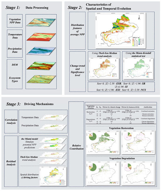 To better study the spatial and temporal evolution characteristics of vegetation NPP and its driving mechanisms in Xinjiang, we implemented three key steps. Firstly, this study pre-processed the NPP remote sensing dataset, temperature data, precipitation data, DEM data, and ecosystem data. Secondly, we used Theil-Sen trend analysis, the Mann–Kendall significance test, and the Hurst index to analyze the spatial and temporal characteristics of NPP changes in Xinjiang and predict future trends. Finally, this study employed correlation analysis and residual analysis to investigate the driving mechanisms of vegetation NPP changes in Xinjiang under the influence of climatic factors and human activities (Figure 2).