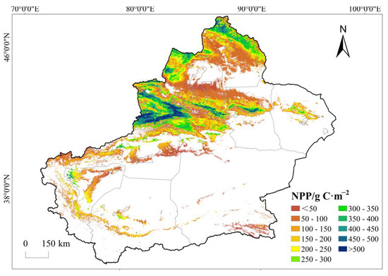 The distribution of vegetation NPP in Xinjiang exhibited significant spatial heterogeneity, characterized by higher values in the northern and western regions compared to the southern and eastern regions (Figure 4). During the study period, the multi-year average vegetation NPP in Xinjiang was 156.33 g C·m−2. According to Jiang et al. [19], NPP in Xinjiang can be divided into high-value (>200 g C·m−2) and low-value (<200 g C·m−2) areas. The high-value areas, which comprised 28.10% of the study region, were primarily located in the Ili Valley, Tianshan Mountains, Altay Mountains, and Tacheng area. In contrast, the low-value areas, covering 71.90% of the region, were pre-dominantly distributed in the Junggar Basin hinterland and the periphery of the Tarim Basin.