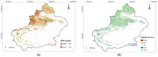Change trend (a) and significance test (b) of NPP in Xinjiang from 2001 to 2022.