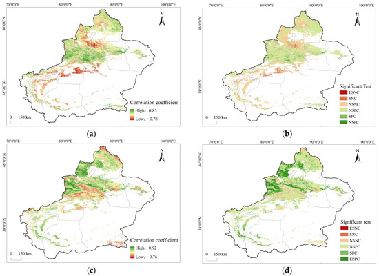 The results of correlation and significance test between NPP and meteorological factors in Xinjiang: (a) partial correlations between annual average temperature and NPP; (b) significance test of annual average temperature and NPP; (c) partial correlations between annual average precipitation and NPP; (d) significance test of precipitation and NPP.
