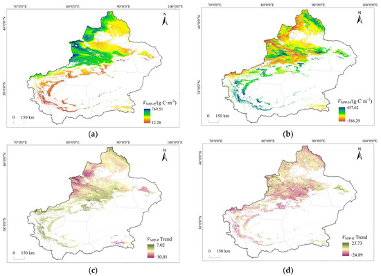 The Miami model was employed to simulate the predicted values of potential NPP from 2001 to 2022. Based on residual analysis, NPP was influenced only by climate change (VNPP-P) and human activities (VNPP-H) were isolated. The overall distribution of potential vegetation NPP (VNPP-P) in Xinjiang is greater in the north than in the south and greater in the west than in the east, under the influence of temperature and precipitation alone (Figure 8a). Notably, the high values have generally shifted to the southwest and northeast, concentrating in the oases at the southern edge of the Tarim Basin, the eastern Ili region, and the Altay Mountains (Figure 8b).